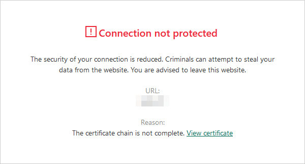 SSL 인증서가 유효하지 않으면 Connection not protected 에러가 표시됩니다.
