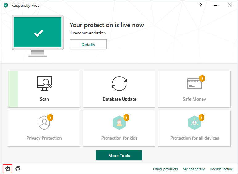 Kaspersky Free를 열고 좌측 하단의 설정(⚙️) 버튼을 클릭합니다.