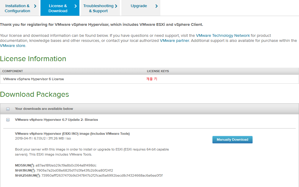 아래 화면의 최신은 ESXi Update 2인데 현재 최신 버전은 ESXi 6.7 Update 3입니다.