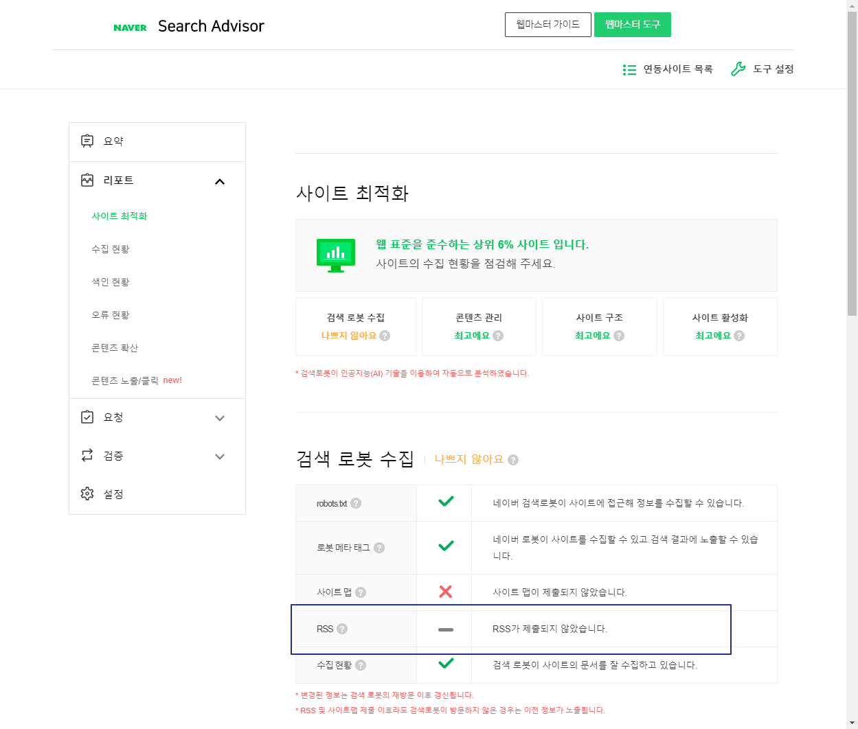 다시 리포트 > 사이트 최적화 메뉴에 보면 RSS가 정상적으로 추가된 것을 확인할 수 있습니다.