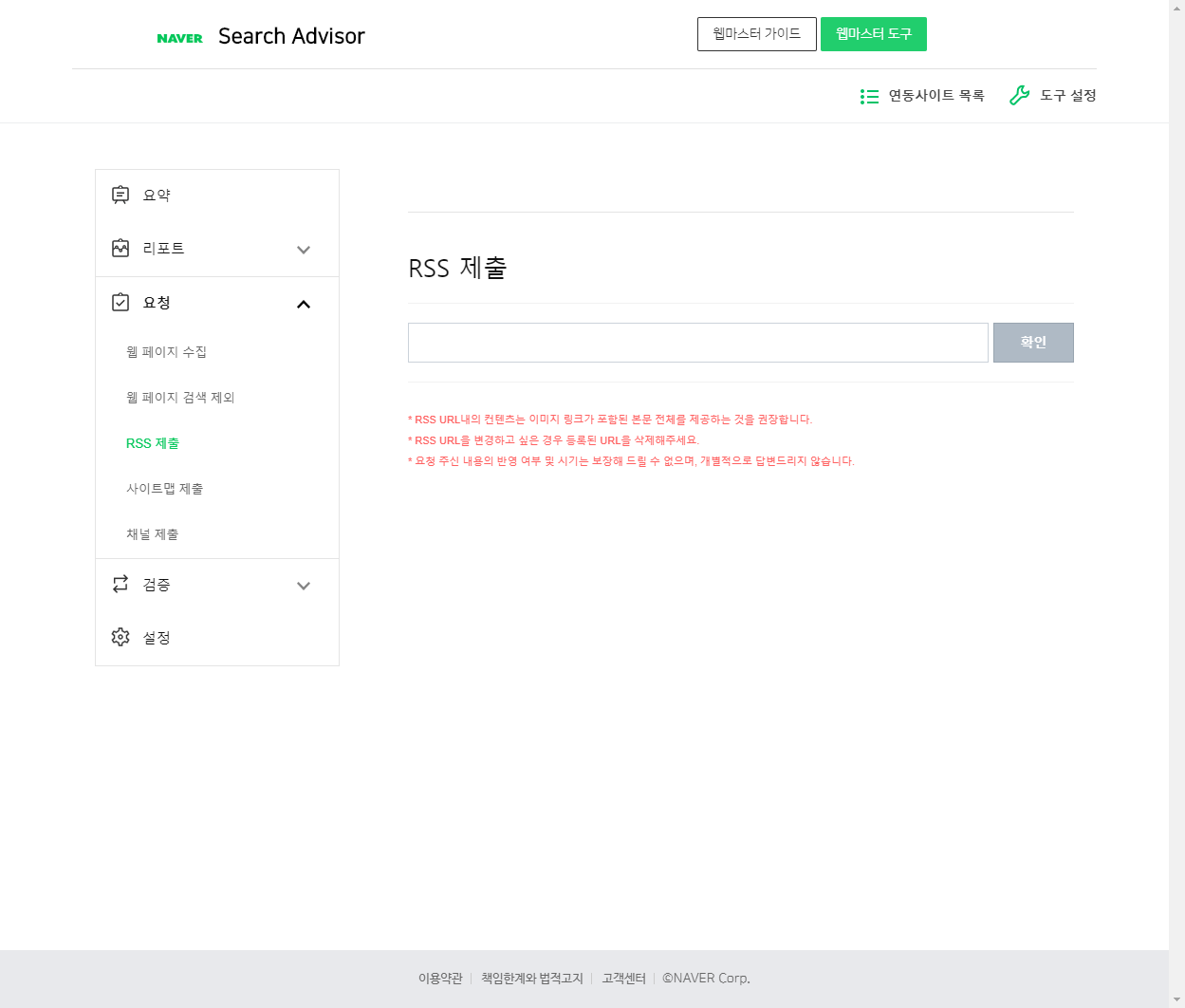 RSS 주소를 제출하기 위해 좌측 메뉴에서 요청 > RSS 제출을 실행합니다.