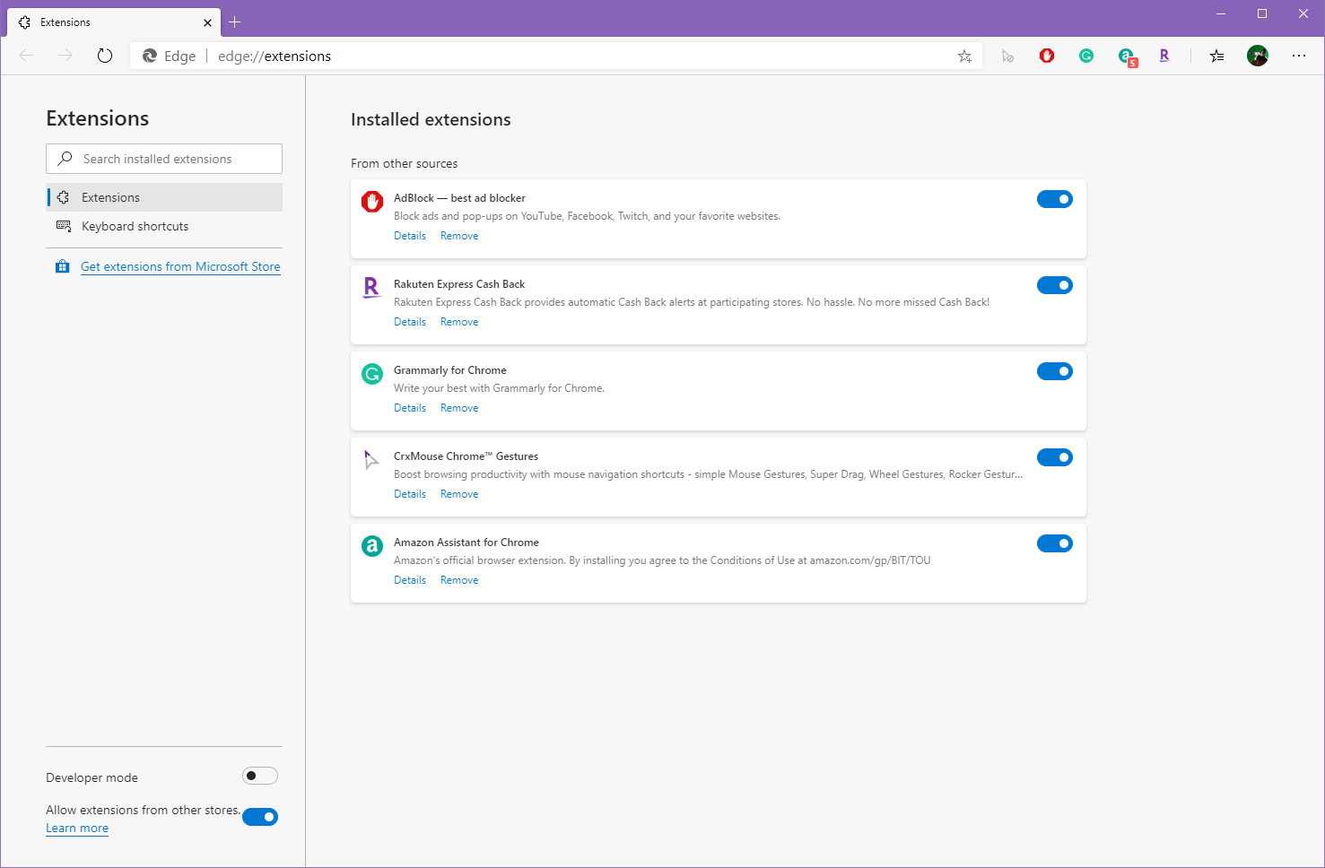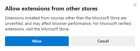 옆의 버튼(Allow extensions from other stores)을 클릭하면 크롬 익스텐션을 사용할 수 있습니다.