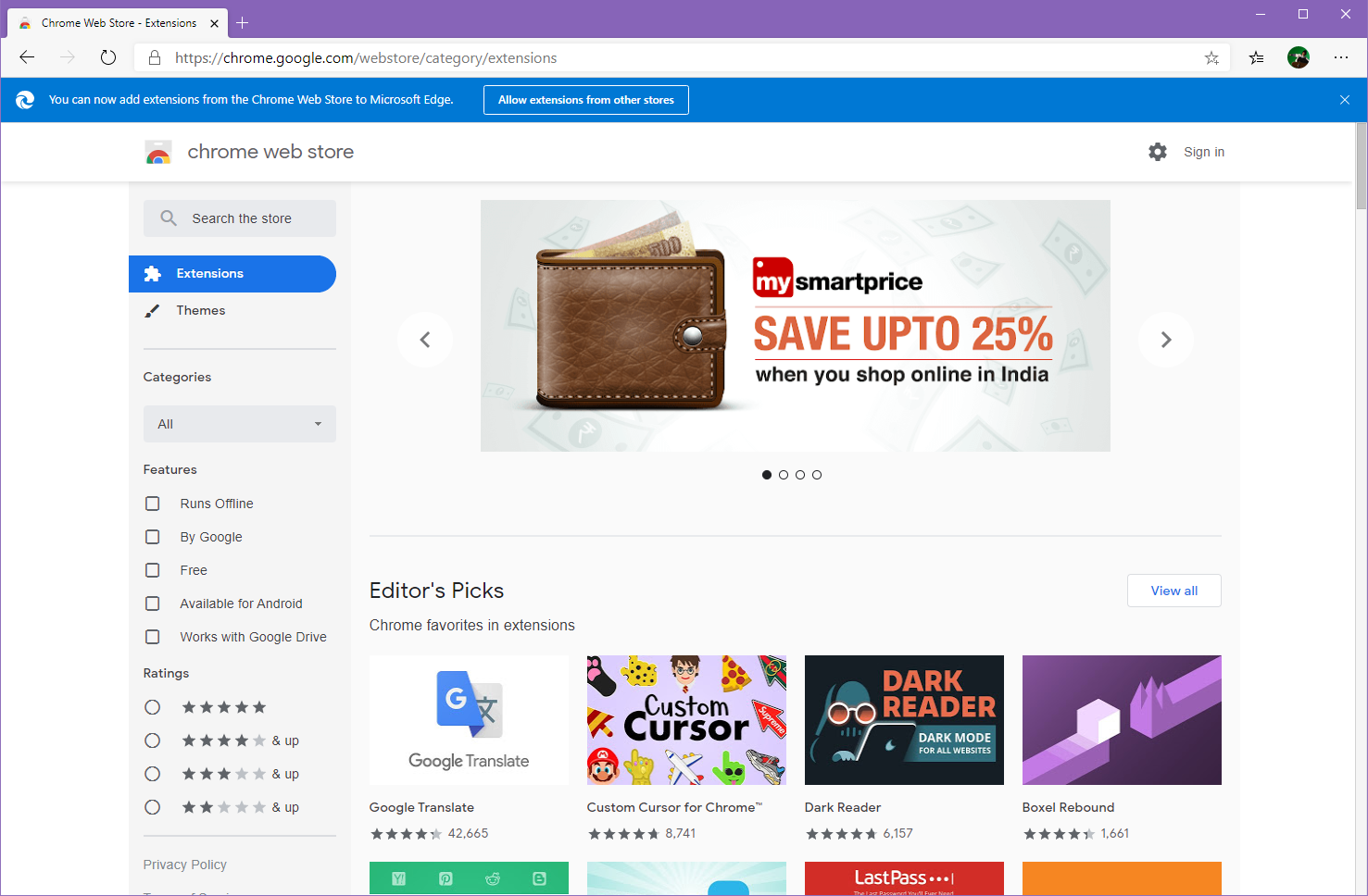 MS에서 새로 출시한 크로미움 기반의 엣지 브라우저는 크롬 익스텐션 설치가 가능합니다.