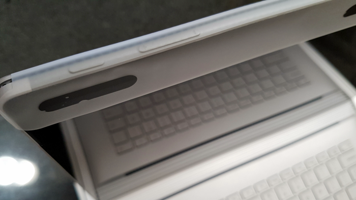 태블릿 역할을 하는 디스플레이 부분의 상단에는 전원 버튼과 볼륨 조절 버튼이 있습니다.