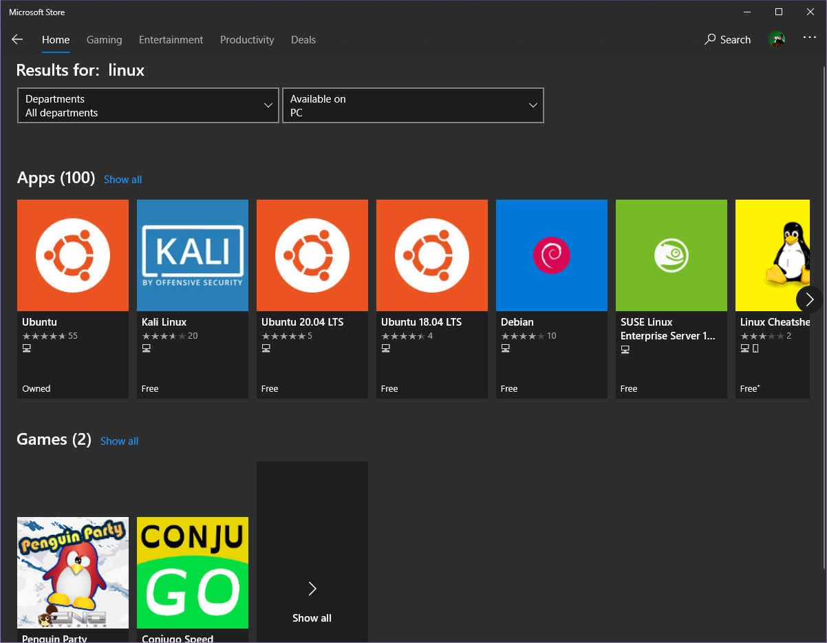 리눅스 배포판은 스토어에서 다운로드할 수 있습니다.