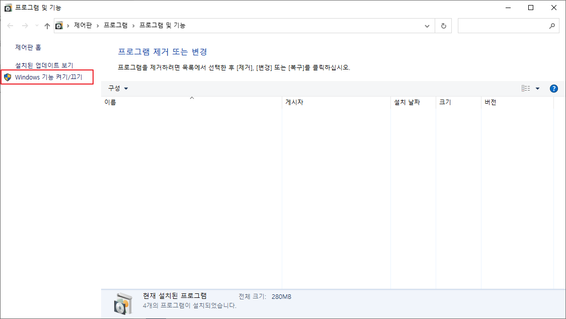 제어판 화면이 표시되면 좌측에서 Windows 기능 켜기/끄기를 실행합니다.