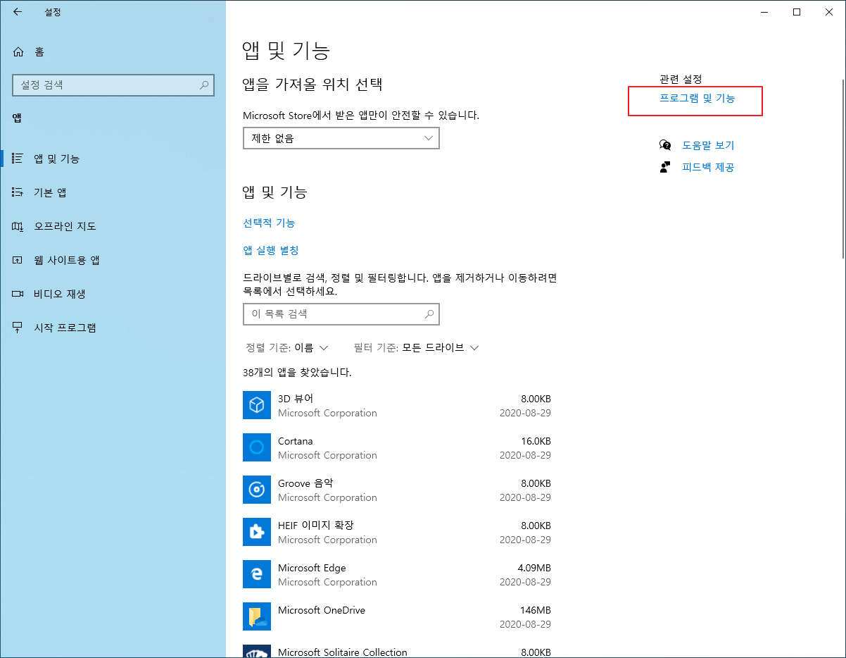 앱 및 기능(설정 -> 앱 -> 앱 및 기능)을 검색해서 실행합니다.