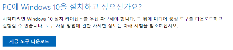 화면에 보이는 지금 도구 다운로드를 클릭하면 설치 USB 생성을 위한 툴을 받을 수 있습니다.
