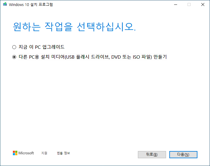 윈도우10 설치 USB를 생성하려면 다른 PC용 설치 미디어 만들기를 선택합니다.