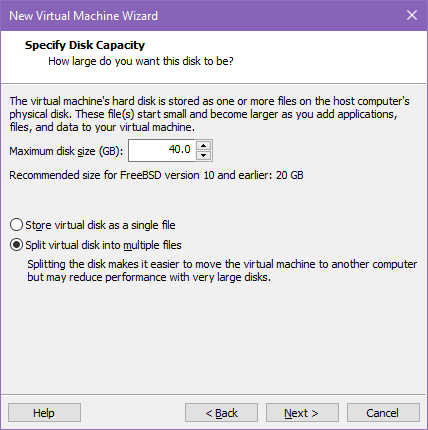 원하는 디스크 크기를 지정하면 되는데 여기서는 40GB로 설정했습니다.