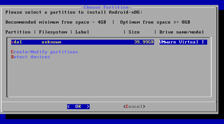 위에서 생성한 파티션을 선택한 상태로 OK를 누릅니다.