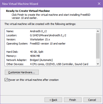 변경된 설정을 확인한 이후에 Finish 버튼을 눌러서 VM을 실행합니다.