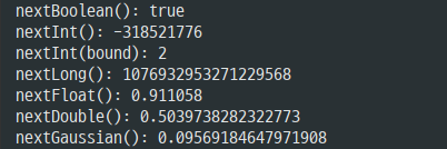 System.out.println("nextInt(bound): " + random.nextInt(bound));