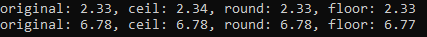 const char* format = "original: %.2f, ceil: %.2f, round: %.2f, floor: %.2f\n";