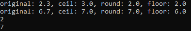 원래 값과 함께 올림 결과(ceil), 반올림 결과(round), 내림 결과(floor)가 순서대로 표시됩니다.
