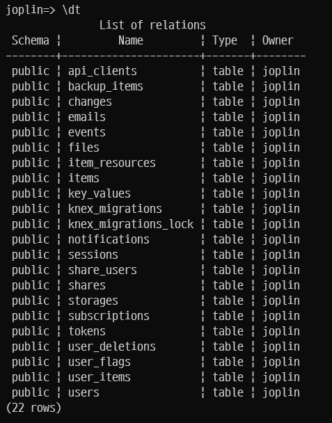 sudo docker exec -it postgres psql -U joplin -d joplin